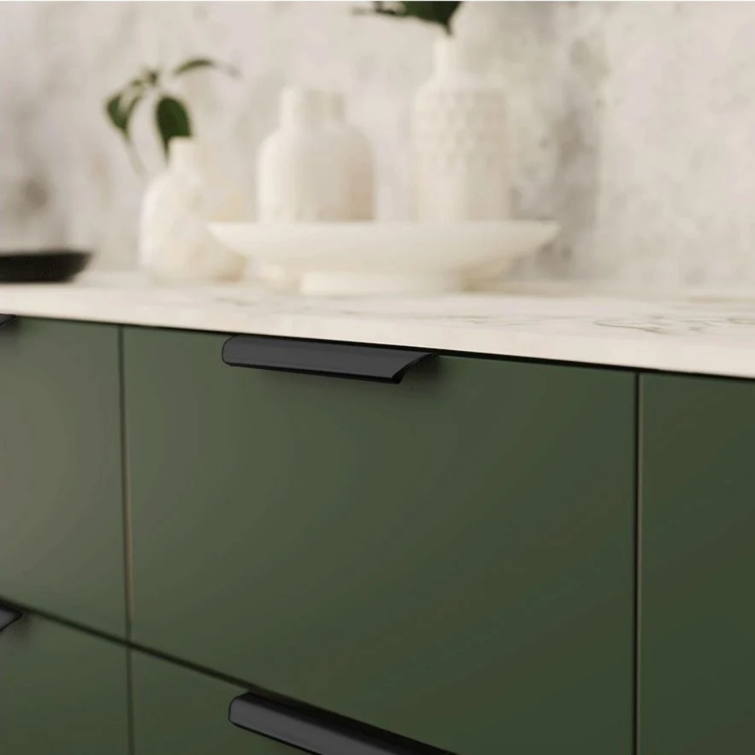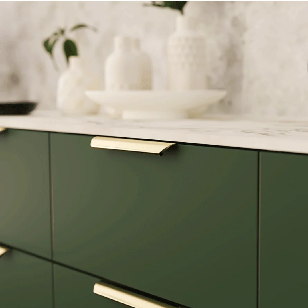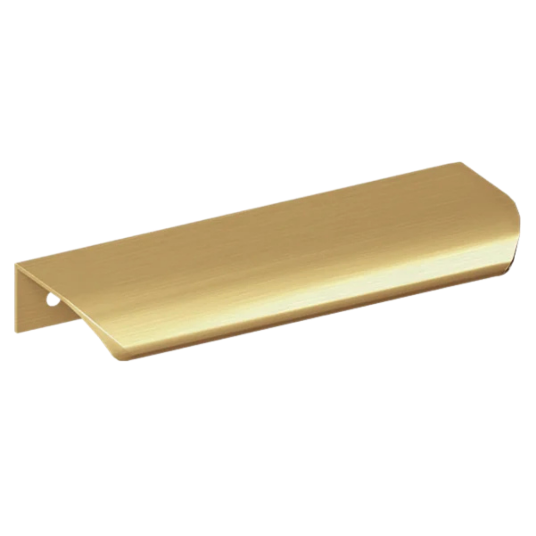 Designul său ușor curbat în jos oferă un plus de rafinament fronturilor și asigură o prindere confortabilă, potrivită pentru utilizare zilnică. Finisajul auriu periat creează un aspect uniform și sofisticat, evidențiind liniile mobilierului și adăugând un accent metalic subtil.